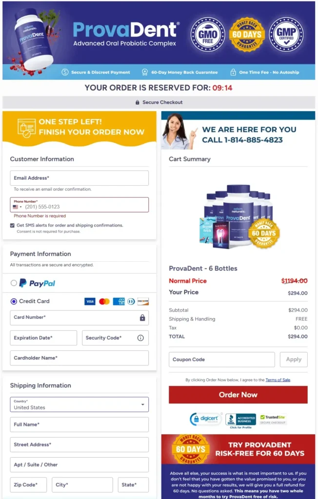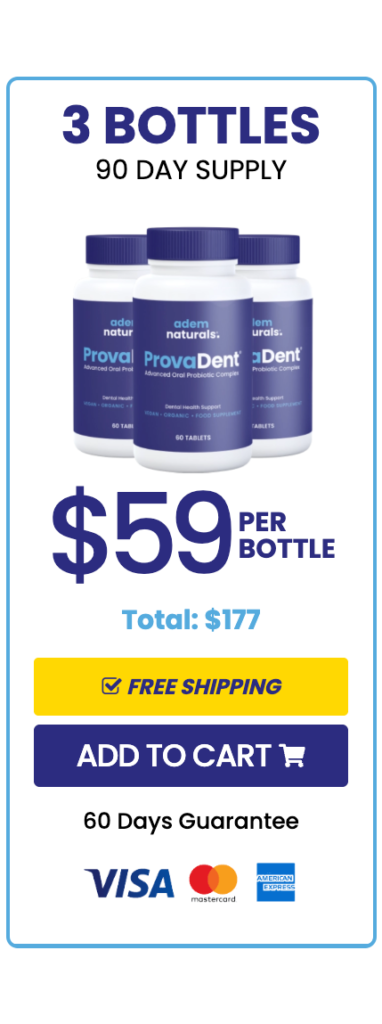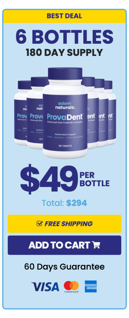 Once you click the “Buy Now” button below, you’ll be directed to our secure checkout page. Simply fill in your details, choose your preferred package, and complete your order. Within moments, your ProvaDent order will be processed, and your bottles will be prepared for immediate shipment from our FDA-registered, GMP-certified facility.
